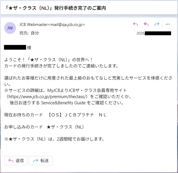 土曜日に申し込んだので、審査に数日はかかるのかな~と思っていたら、4分くらいで ”「★ザ・クラス(NL)」発行手続き完了のご案内” メールが送られてきて、あっさり審査に通りました。インビテーションが送られてくる時点で審査は終わっているのでしょう。(”招待”しているわけだから当たり前か…)